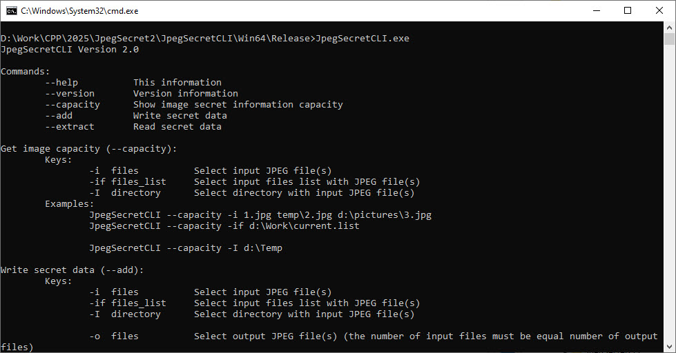 Приложение JPEGSecretCLI немного отличается по возможностям от приложения JPEG Секрет. Главное применение этойконсольной утилиты - возможность добавления секретной информации в JPEG изображения и извлечение сектретной информации из JPEG изображений в автоматическом режиме. Достаточно написать небольшой BAT файл, чтобы автоматизировать рутинные действия.