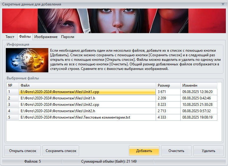 Для добавления файлов можно использовать диалог выбора файлов (кнопка Добавить). Также отдельные файлы можно удалить или очистить венсь список целиком.