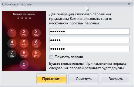 Создание сложного пароля состоит из вычисления хэша от трёх простых паролей.