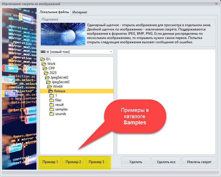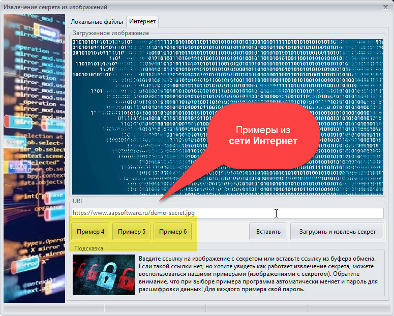 Каждый из примеров использует свой пароль к зашифрованным данным, он меняется программой во время демонстрации автоматически.