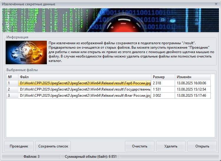 Если в изображении был сохранён файл или несколько файлов, то появится таблица со списком этих файлов. Файлы уже сохранены на диске, их можно открыть с помощью двойного щелчка мышью или сперва открыть Проводник, а далее работать с файлами через него.