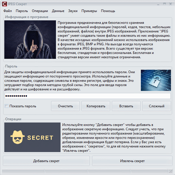 Кнопка Добавить секрет открывает новый диалог с настройками для добавления секретной информации в JPEG изображение.